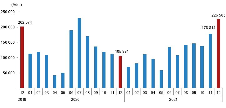 Türkiye genelinde konut satışları Aralık ayında bir önceki yılın aynı ayına göre %114 artarak 226 bin 503 oldu. Bu rakam ile konut satışı bir önceki aya göre yüzde 27, 2020’nin aynı ayına göre ise yüzde 114 arttı. Aralık’ta ikinci el konut satışı bir önceki aya göre yüzde 22, geçen senenin aynı ayına göre ise yüzde 117 yükseldi ve 149 bin 756 adet oldu. İpotekli konut satışları ise bir önceki yılın aynı dönemine göre yüzde 209 arttı ve 45 bin 260 olarak kaydedildi.